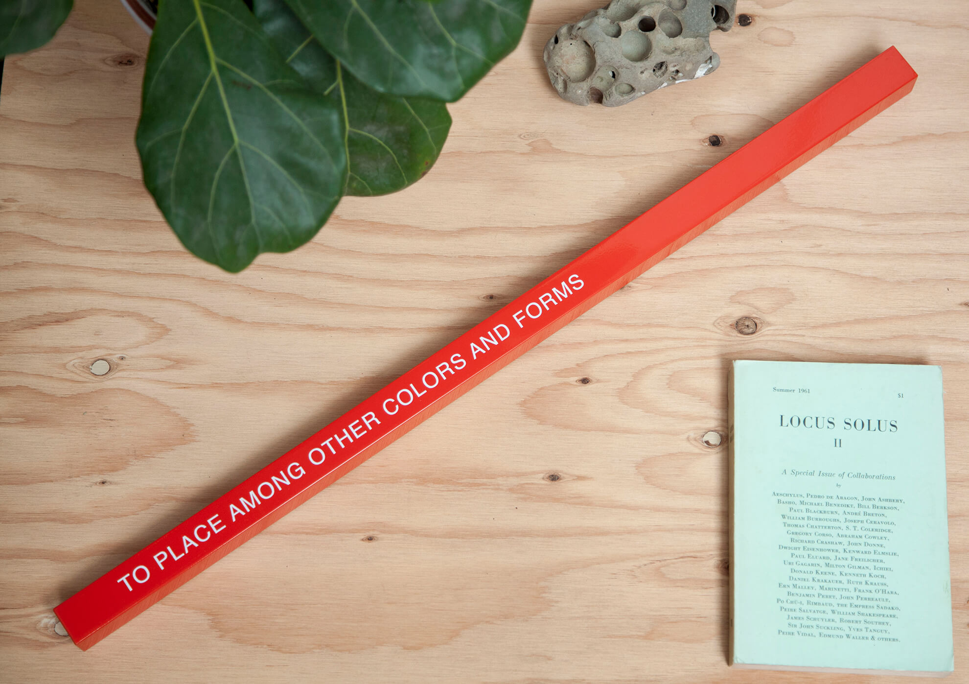 Lire la suiteA solid aluminum bar, painted a striking red-orange, and bearing the text “TO PLACE AMONG OTHER COLORS AND FORMS.” Limited to a numbered edition of 25 with accompanying edition card, produced and signed by Clark. This is an artwork intended to occupy different areas of your home over time, creating new relational experiences in areas you may have become “blind” to from over-familiarity. This piece asks you to re-see the arrangement it sits with as…